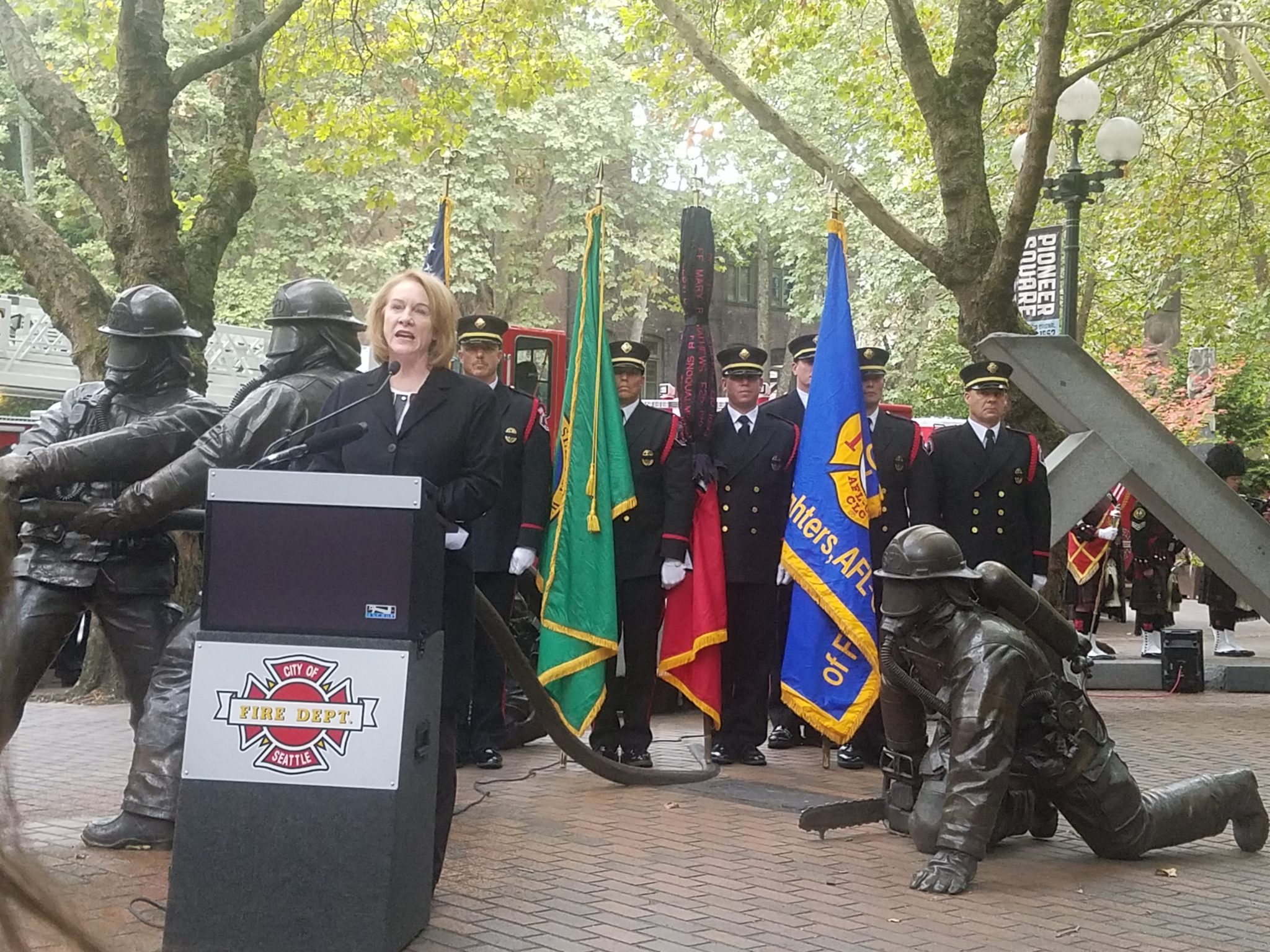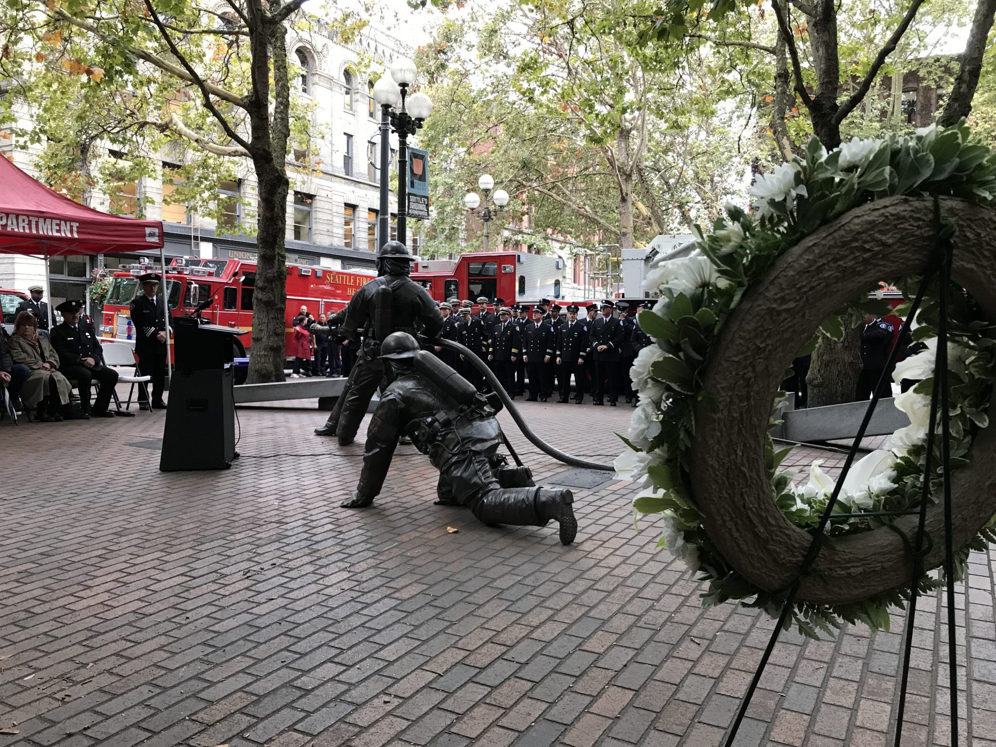 They gathered at Seattle’s Fallen Firefighter Memorial, located in Occidental Park. The memorial depicts four firefighters battling an imaginary blaze and is flanked by panels of stone, crisscrossed and laying down to represent collapsed walls.