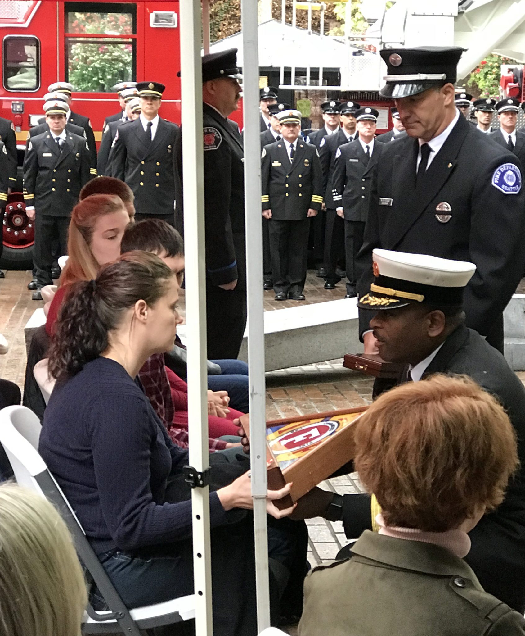 - Seattle Fire Chief Scoggins carries the union flag to Capt. Aman’s widow. The Department accepted the flag on her behalf at a ceremony in Colorado Springs in September. IAFF Local 27 President Stuart joins Scoggins.